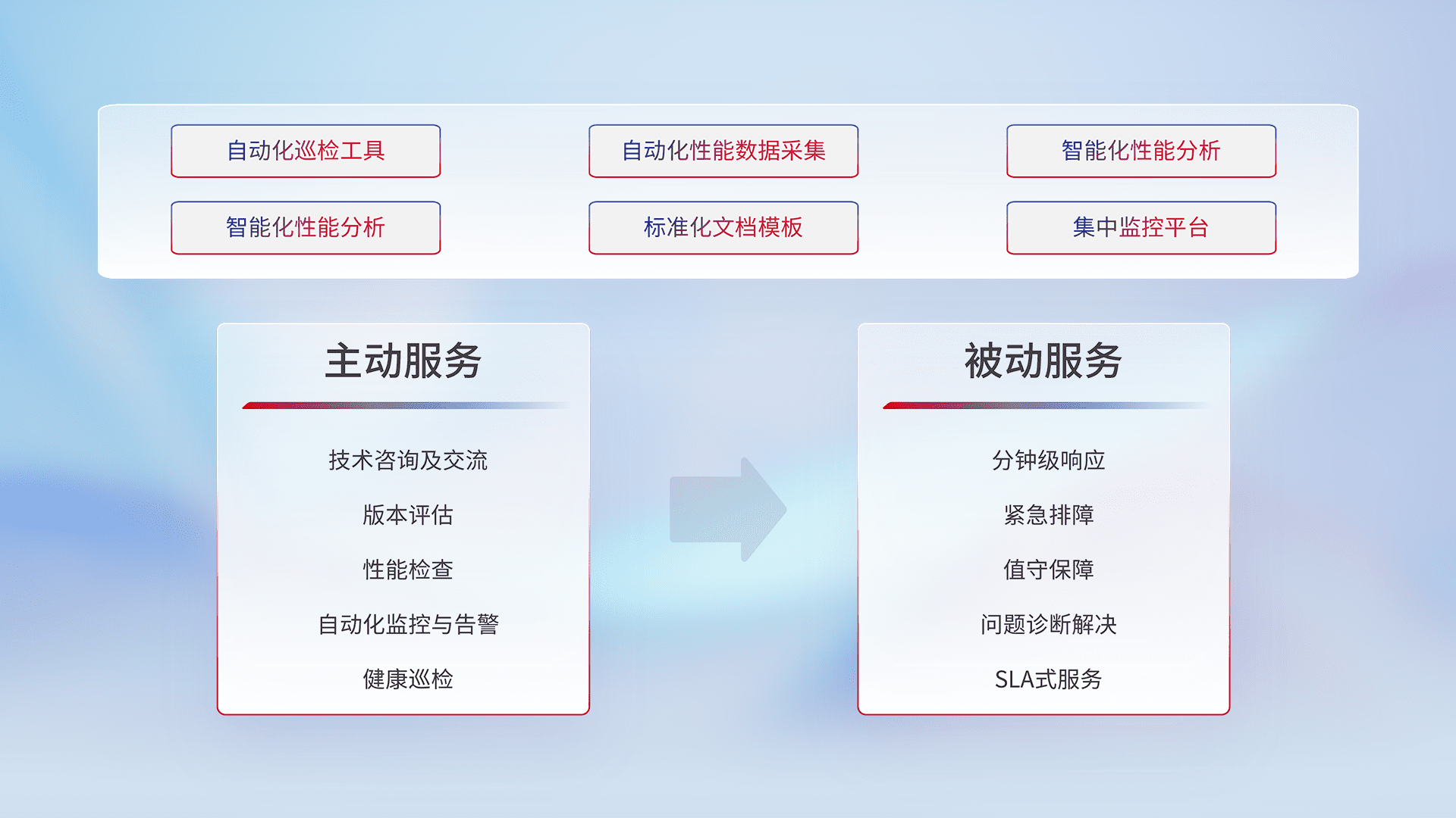 智能化工具和标准化文档,,,,保障服务质量,,提供主动服务(包含技术咨询、、版本评估、、性能检查、、、自动化监控与告警、、、、健康巡检)和被动服务包含(分钟级响应、、、紧急排障、、值守保障、、问题诊断解决、、、SLA服务)。。