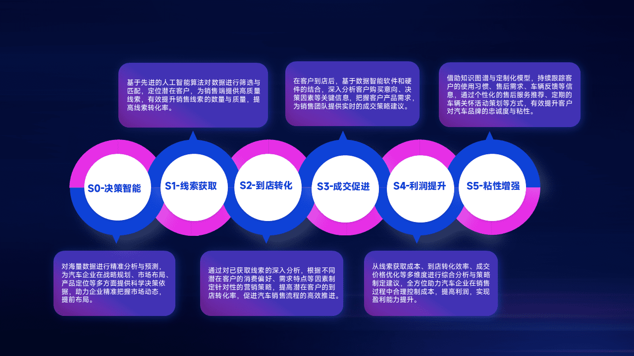 基于销售转化漏斗的薄弱环节,,为客户提供数据+模型+运营的智能应用,,,实现销售业绩的提升;推动线索管理全链路的精细化管理和运营。。。。